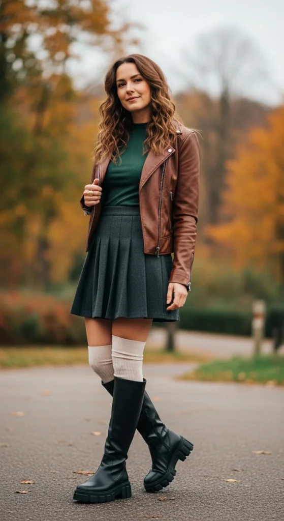 Knee socks layered under a skirt or shorts and boots protect your legs from cold air. They also add character.