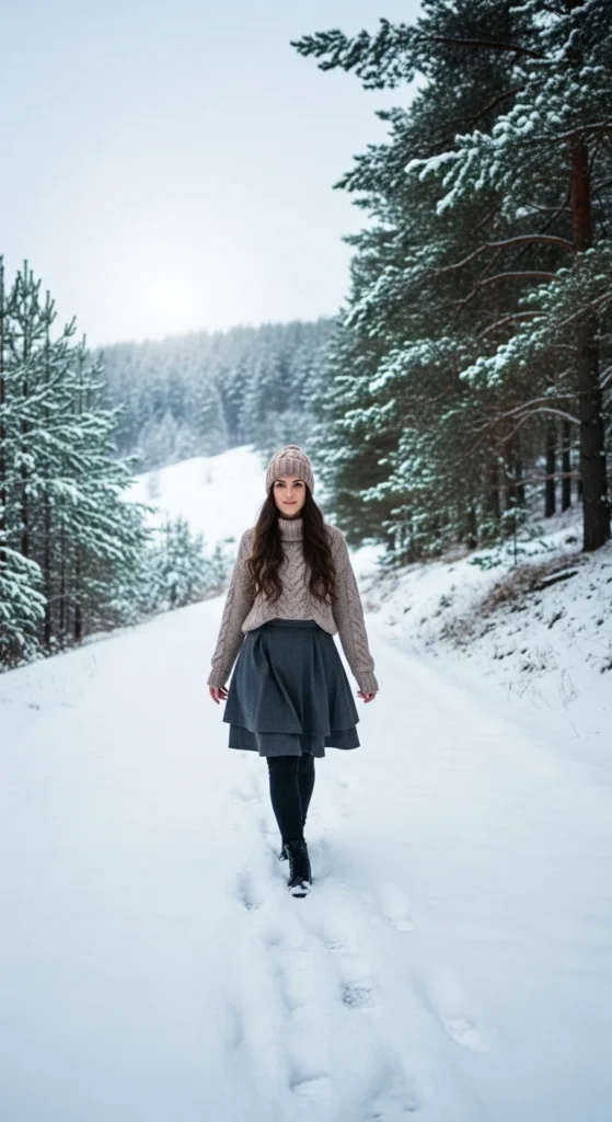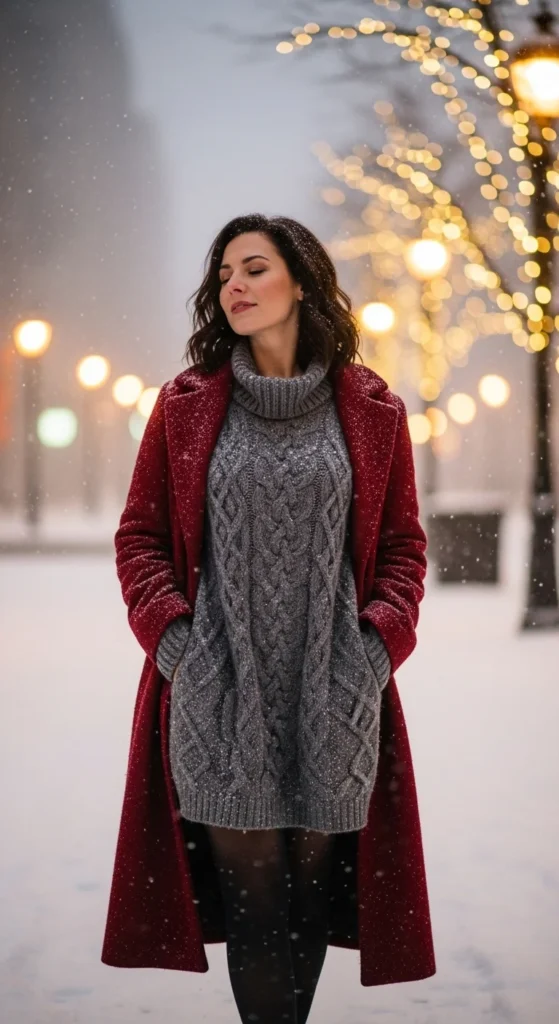 A chunky knit sweater is one of the easiest outdoor pieces to work with. It traps heat and adds instant winter style. Start with a thin thermal top underneath. This base layer holds warmth close to your body without feeling bulky. On top, wear your favorite oversized knit in a neutral or holiday color.