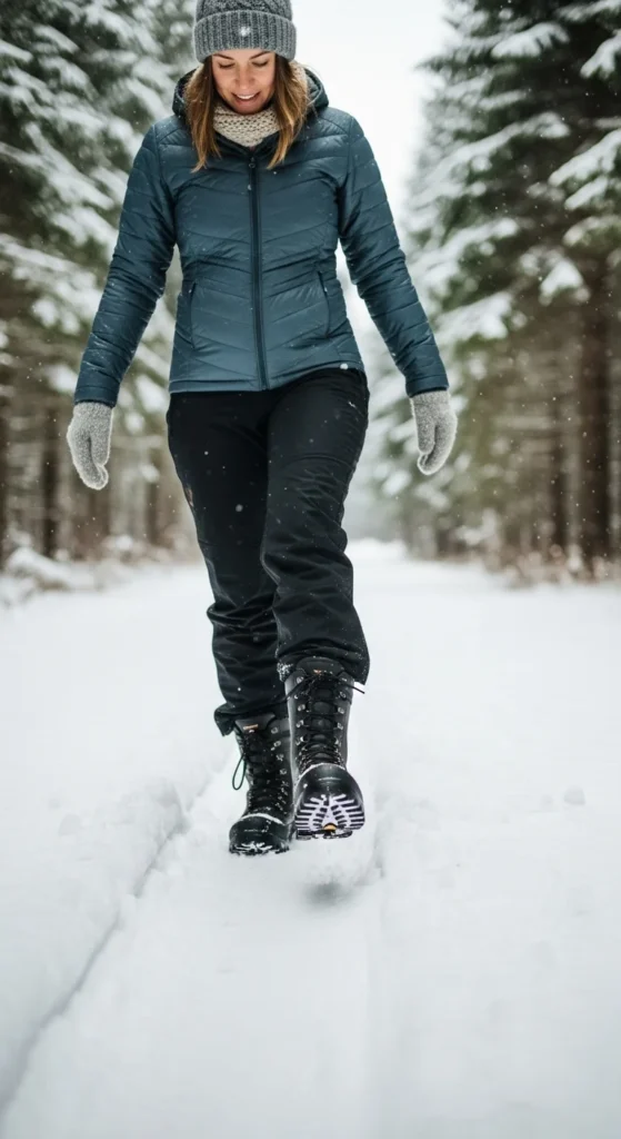Inside the coat, wear a light sweater and trousers. You do not need too many layers because quilted coats hold heat well. Choose waterproof boots if it is snowy or wet outside. Thick socks can make simple boots feel warmer.