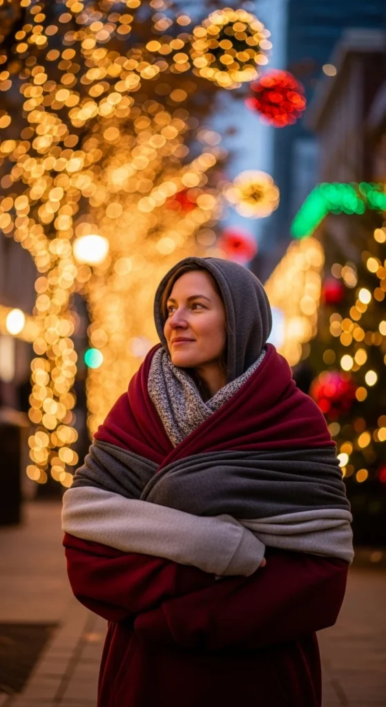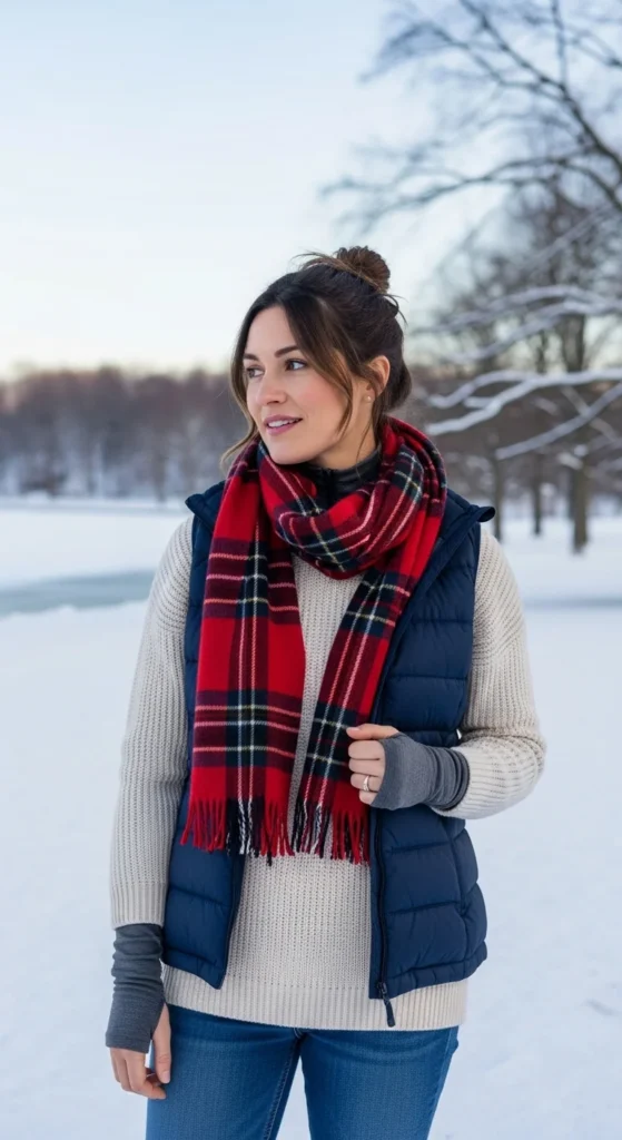 Accessories can change everything. A plaid scarf instantly feels festive. A warm beanie keeps your head protected from cold air. Together, they add both function and style.