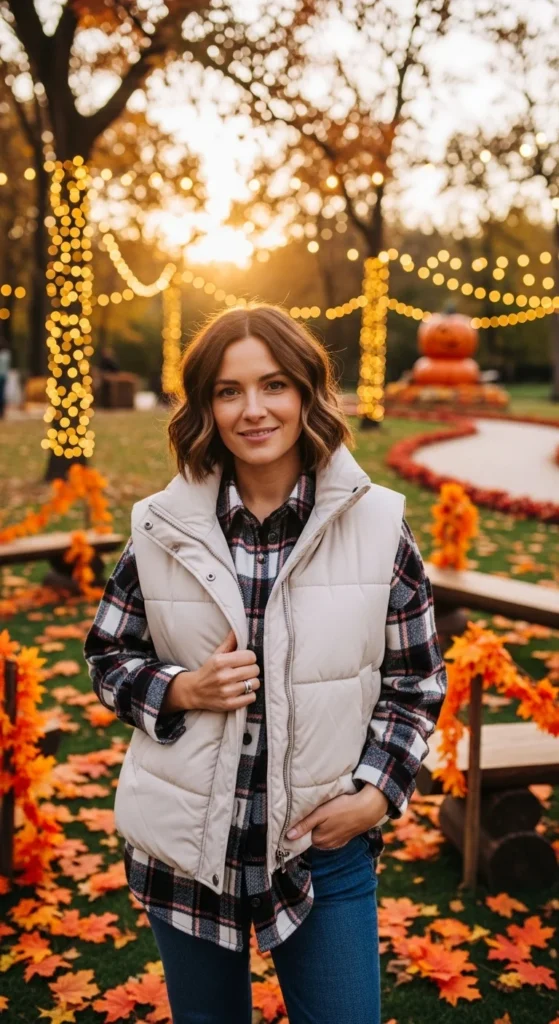 This outfit is easy to create with basic pieces. Layering a vest over flannel is simple and effective for chilly weather.