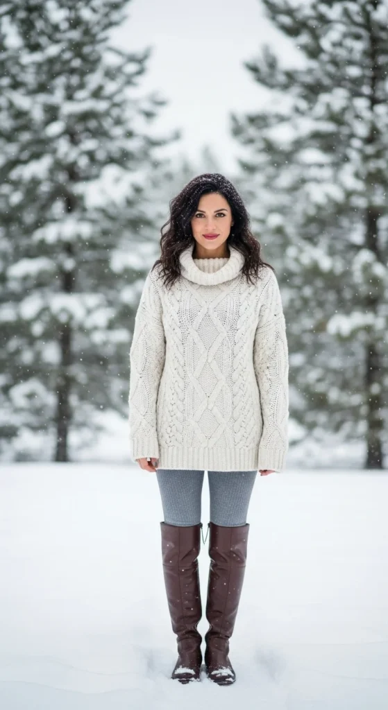 If you cannot afford new sweaters, check thrift shops. Many have thick knits for a very low price. You can also borrow one from family. Pair this with fitted jeans or leggings. Add a warm scarf and gloves for extra comfort. Boots finish the look.