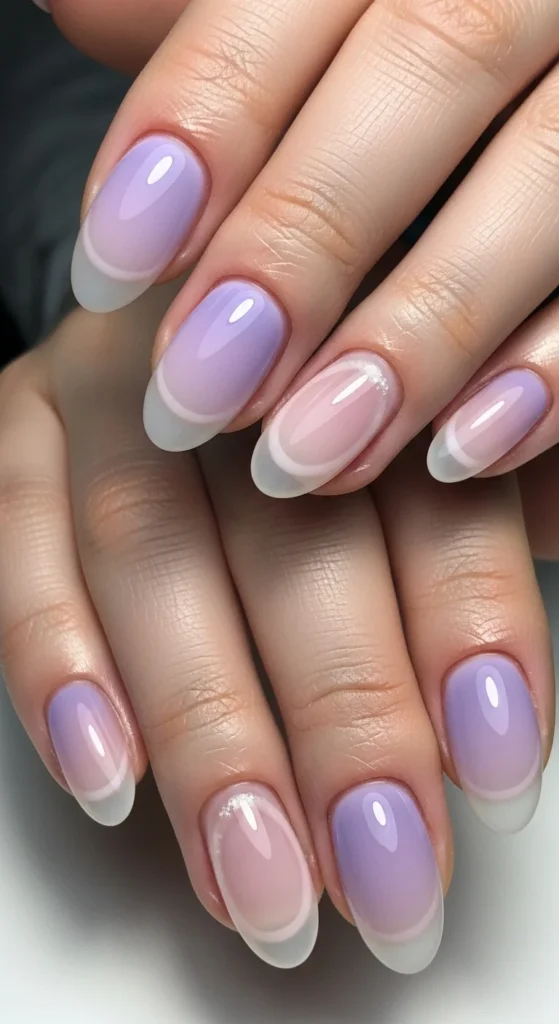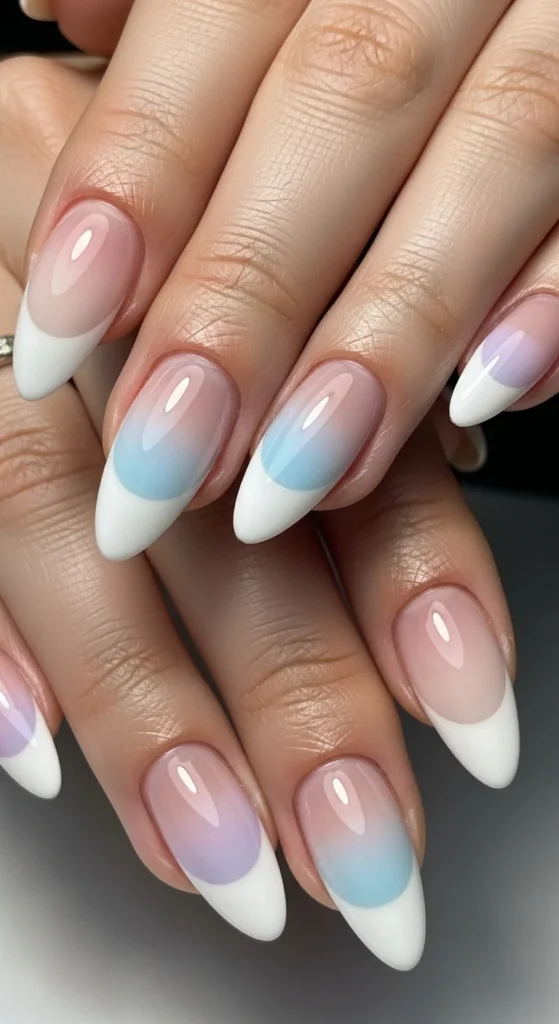 Ombre French combines two classic looks. Paint pastel base, fade into white tips with a sponge or brush. Medium nails work best. DIY: gently dab for smooth transition. Top coat ensures longevity. Perfect for spring events or office wear. Soft gradient keeps nails elegant and approachable.