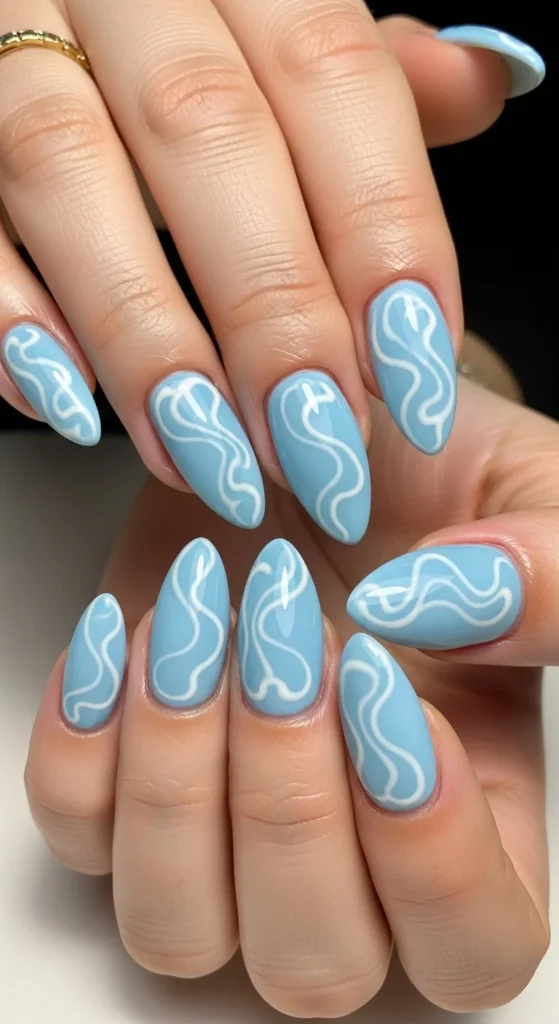 Swirl art creates soft motion on nails. Paint base baby blue, then add white swirls with a thin brush. Top with clear polish. Works best on almond or medium nails. DIY-friendly: practice on a palette before applying. Adds artistic flair while keeping it light. Ideal for spring outings or creative looks. Subtlety maintains elegance.