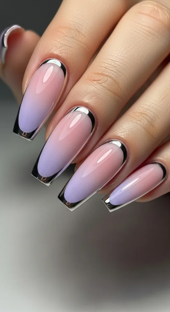 Ombre with chrome adds a modern twist. Paint pink to lilac gradient, then use chrome polish for accent lines. Top coat protects shine. Works on medium to long nails. DIY: use thin striping tape for precision. Chrome elevates pastel look, making it appear more expensive. Perfect for parties or special occasions. Keeps nails playful yet sophisticated.