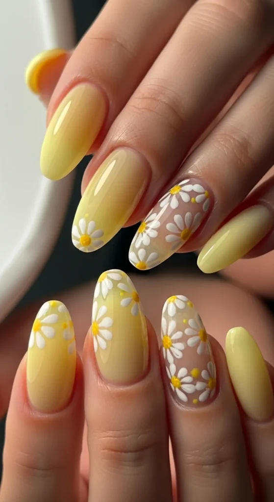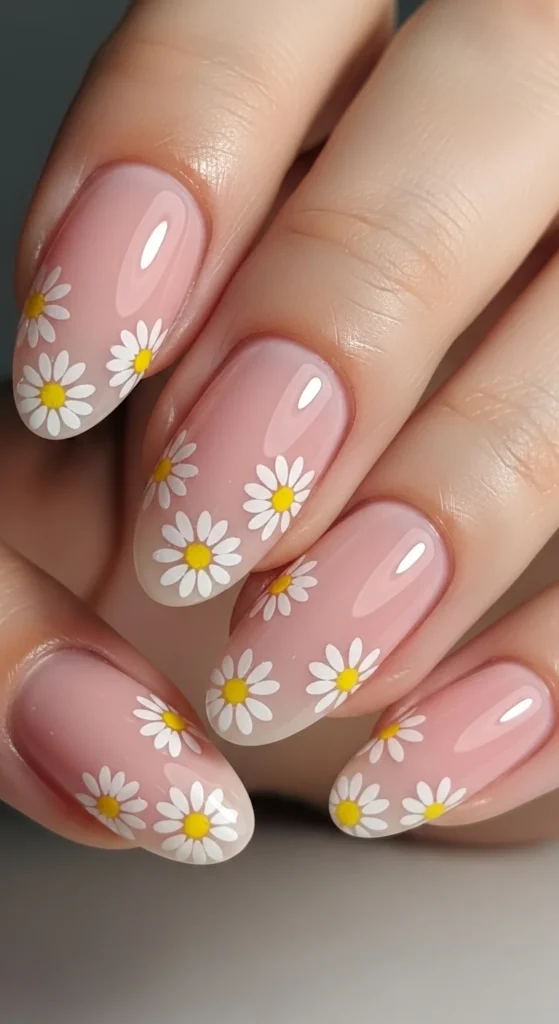 Daisy accents are cute and spring-appropriate. Paint yellow base, then add small white flowers with a brush or decals. Seal with top coat. Works on short and medium nails. Affordable DIY: use nail stickers or paint directly. Ideal for casual weekends or outdoor events. Keeps nails cheerful without heavy design.