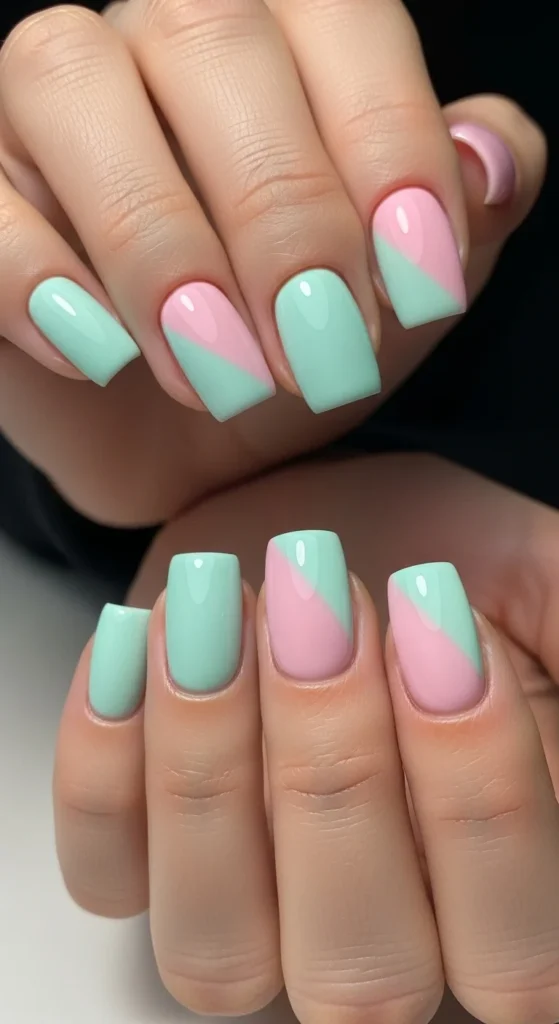 Color-block nails are fun and modern. Use tape to separate mint and pink diagonals. Paint each section carefully. Works on short nails. Top coat ensures clean finish. DIY-friendly with inexpensive polishes. Great for casual wear, spring activities, or Instagram photos. The contrast is subtle yet eye-catching.