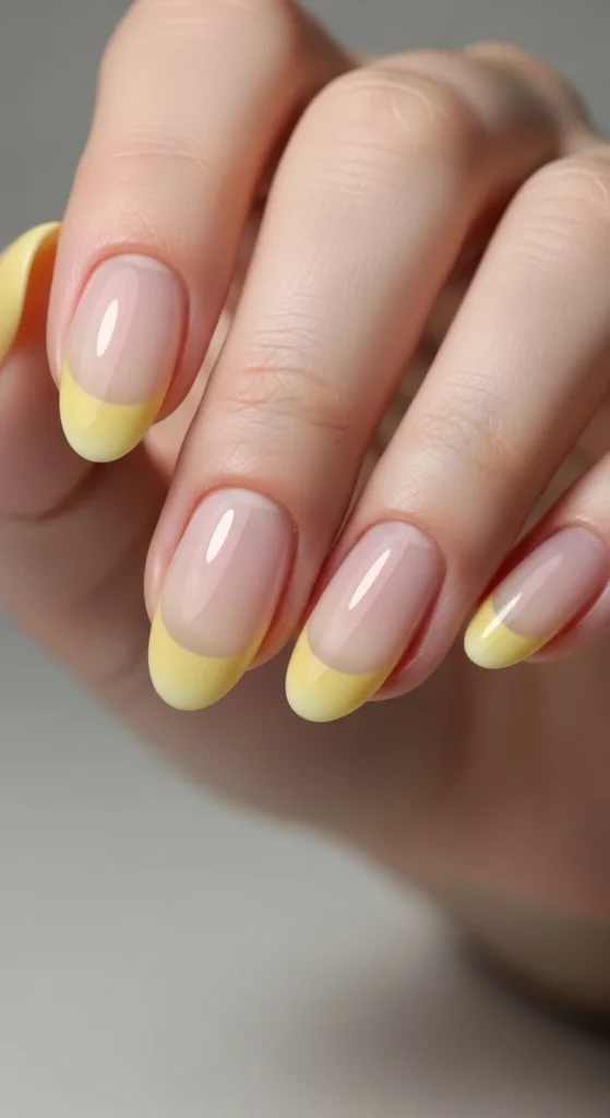 French tips in yellow feel playful and light. Apply clear or nude base. Paint tips in soft yellow. Short nails are ideal. DIY: tape off tips for clean lines. Glossy top coat ensures shine. Perfect for spring and summer. Keeps nails bright and approachable while staying simple.