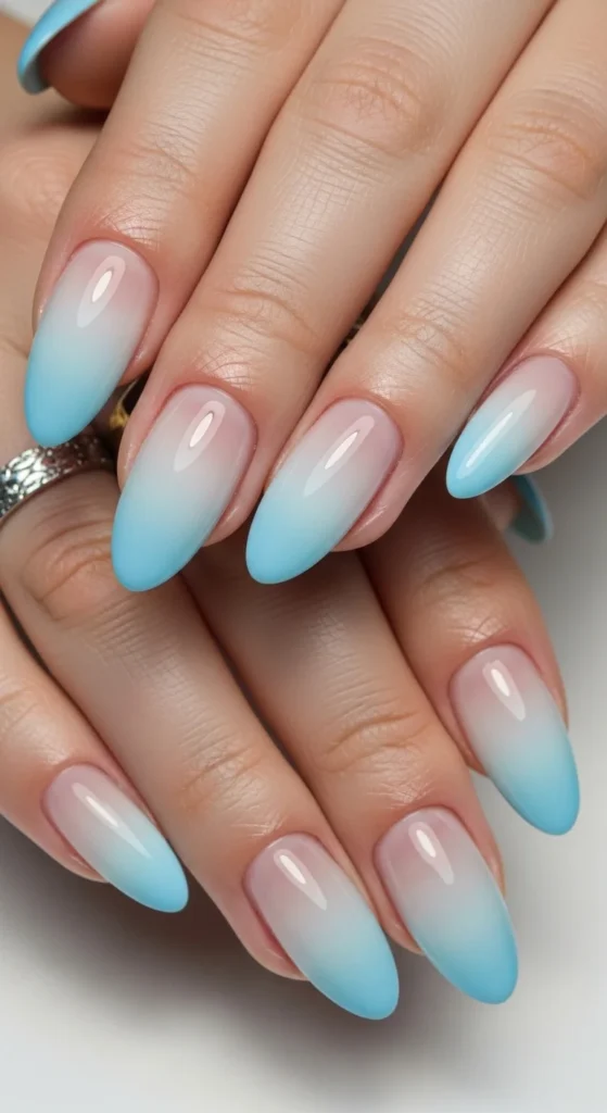 Ombre nails give a gentle color transition. Apply light blue at the base and blend into a darker baby blue at the tip using a sponge. Finish with a clear top coat. Perfect for medium to long nails. This DIY-friendly technique uses two inexpensive polish shades. Ombre nails pair well with simple rings or bracelets for a dreamy spring vibe. The soft fade keeps it subtle for everyday wear.