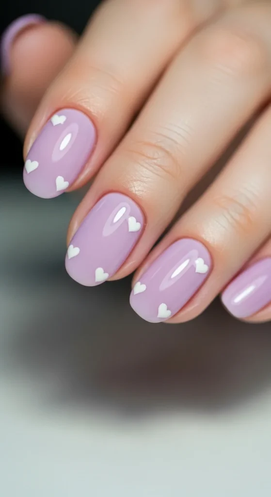 Micro hearts are cute yet subtle. Paint lavender base, add tiny white hearts with a dotting tool. Works on short nails. DIY-friendly and inexpensive. Top coat protects design. Suitable for casual outings, dates, or spring events. Minimalist approach keeps nails playful but not overwhelming.