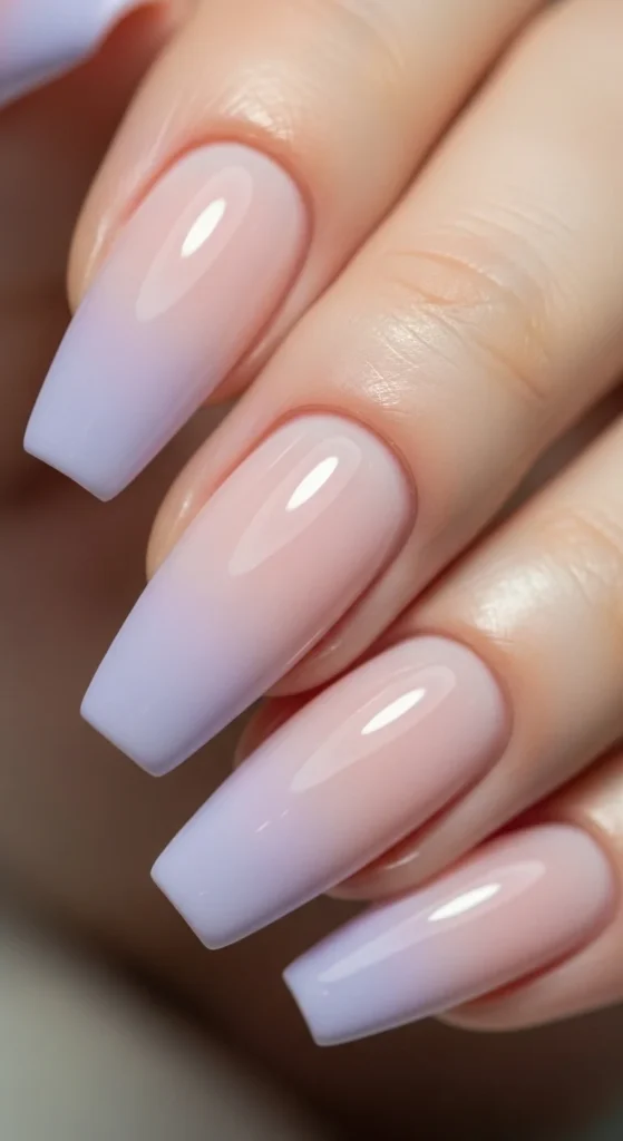 Gradient between pink and lavender is soft and feminine. Apply blush pink at base, fade into lavender tips. Use a sponge for blending. Medium to long nails work best. Top coat seals polish. DIY-friendly with affordable polishes. Great for spring, parties, or casual settings. Soft transition keeps nails dreamy and approachable.