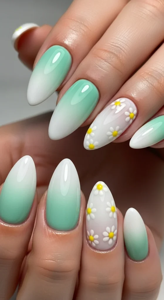 Mint ombre nails are playful. Blend mint base into white tips. Add tiny daisy decals or paint on tips. Medium-length nails work best. DIY-friendly using stickers or thin brush. Top coat protects design. Perfect for spring outings or casual events. Combines gradient elegance with floral charm.
