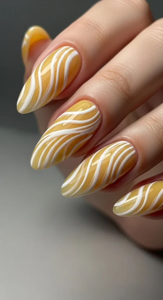 Swirl nails add movement. Paint yellow base, then white swirls with a thin brush. Medium nails work well. DIY-friendly: practice first on paper. Top coat ensures smooth finish. Suitable for casual spring wear. Keeps nails playful but subtle.