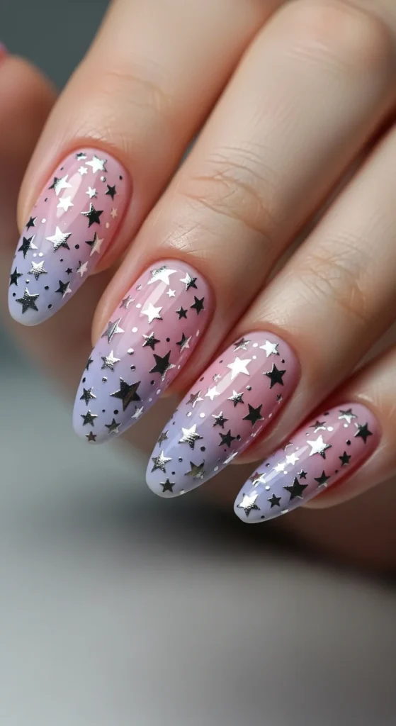 Stars add charm to ombre nails. Blend pink to lavender, apply small star decals. Medium nails work best. DIY-friendly with stickers. Top coat seals design. Ideal for spring parties or evenings. Keeps nails whimsical without heavy design.