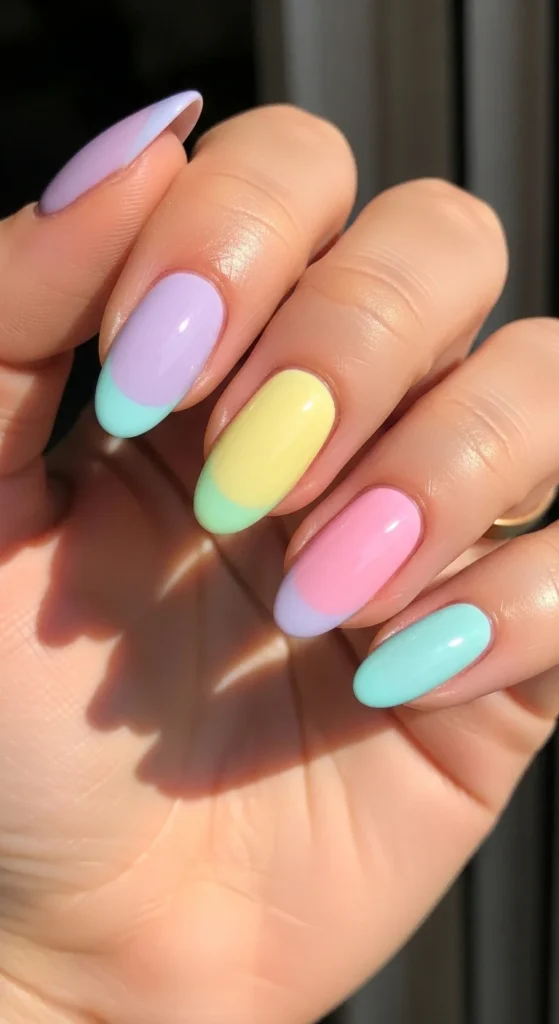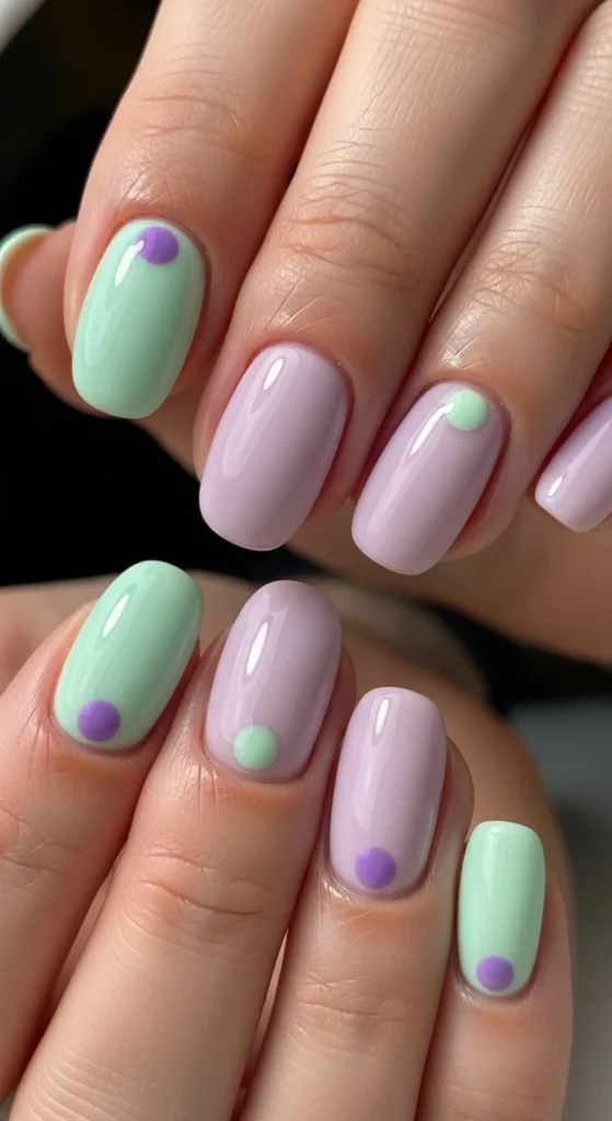 Alternating pastel nails are simple yet stylish. Paint nails in mint and lavender, add tiny dots on accent nails. Short nails work well. DIY-friendly and budget-conscious. Top coat ensures longevity. Perfect for everyday wear, spring outings, or casual events. Minimal design keeps nails chic and approachable.
