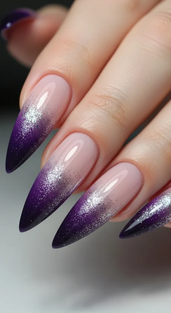 Ombre plus glitter creates subtle drama. Start with lilac at the base, blending into deeper purple tips. Lightly sprinkle fine glitter. Top with a clear coat for smooth finish. Works on medium to long nails. DIY-friendly using a sponge and brush. Glitter adds sparkle without heavy polish. Perfect for evenings or celebrations while keeping nails elegant and wearable.