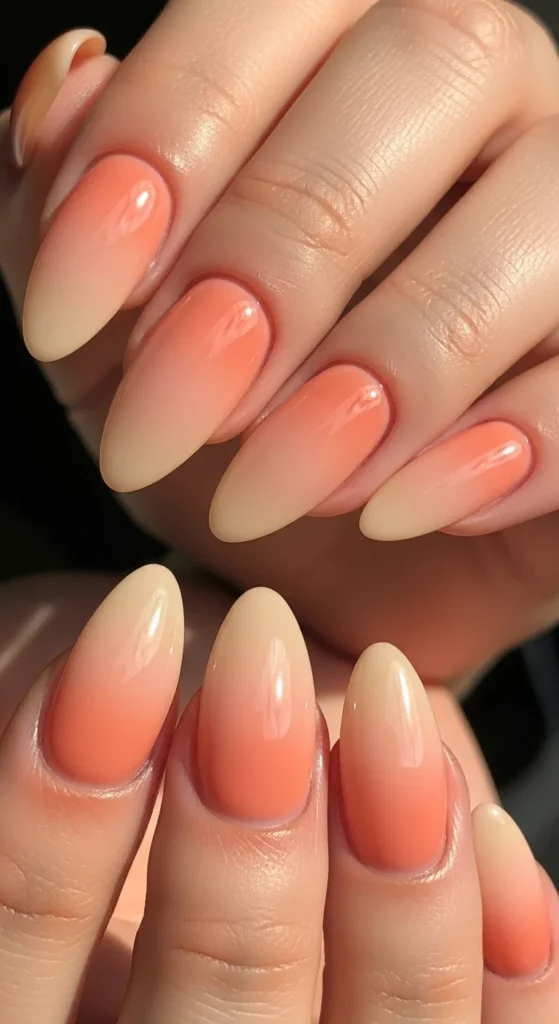 Gradient nails add dimension. Blend two peachy shades from base to tip. Use a sponge or brush to smooth transitions. Top with clear coat. Works on medium or long nails. DIY tip: blend colors lightly for a soft, airy effect. Elegant enough for weddings or office wear, casual enough for everyday. Subtlety keeps nails sophisticated.