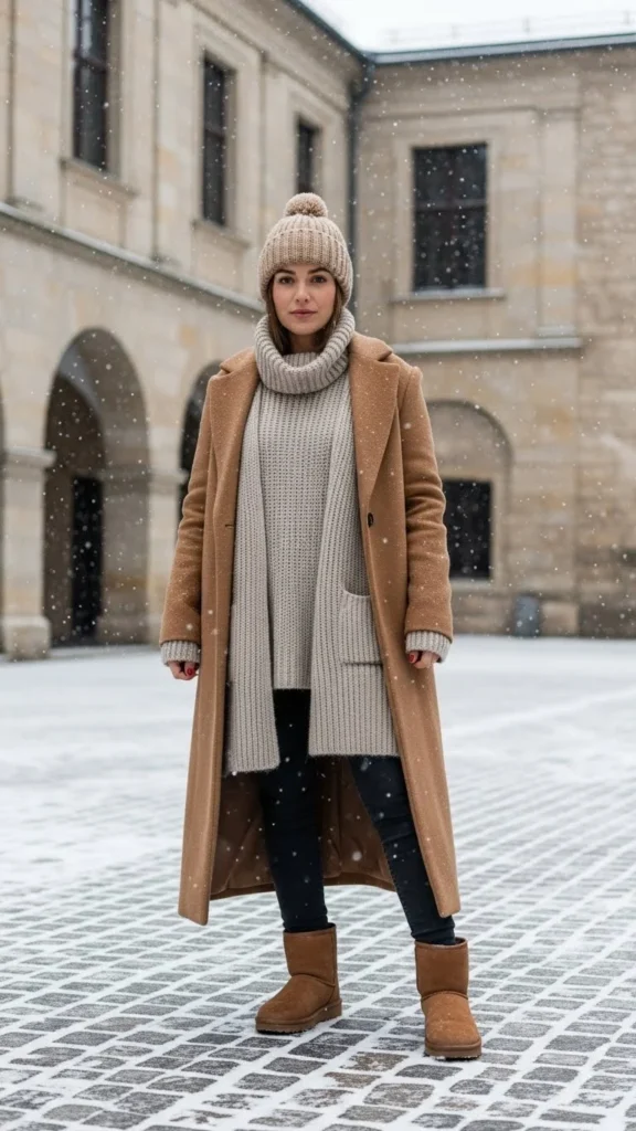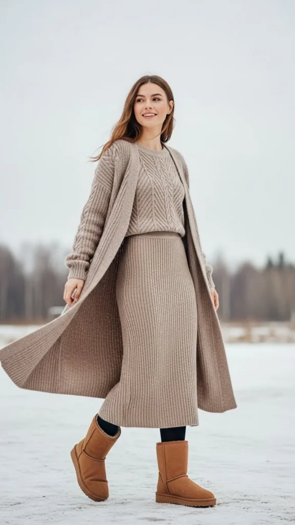 A knit skirt extends the soft theme. A long cardigan adds movement. This outfit works for indoor–outdoor winter days. You can layer tights underneath the skirt. Stick to neutral knits for a smooth look. Add a belt if you want more shape.