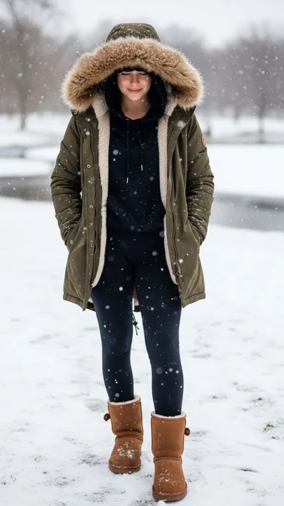Athleisure sets pair surprisingly well with shearling textures. A parka keeps the core warm. This look suits long walks or active winter days. Choose leggings with fleece lining. A simple beanie brings the outfit together.