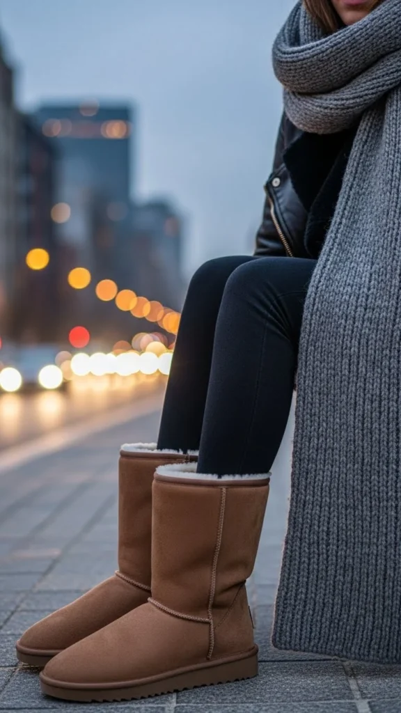 Skinny jeans tuck neatly into shearling boots, letting the texture stand out. An oversized sweater adds balance and warmth. This outfit suits errands, weekend walks, or relaxed meetups. Choose jeans with stretch for comfort. You can thrift oversized sweaters or size up for a cozy fit. Earth-tone sweaters pair well with tan or chestnut shearling. A long coat creates a smooth vertical line. Add a beanie to match the boots’ lining.