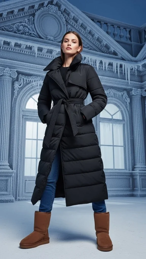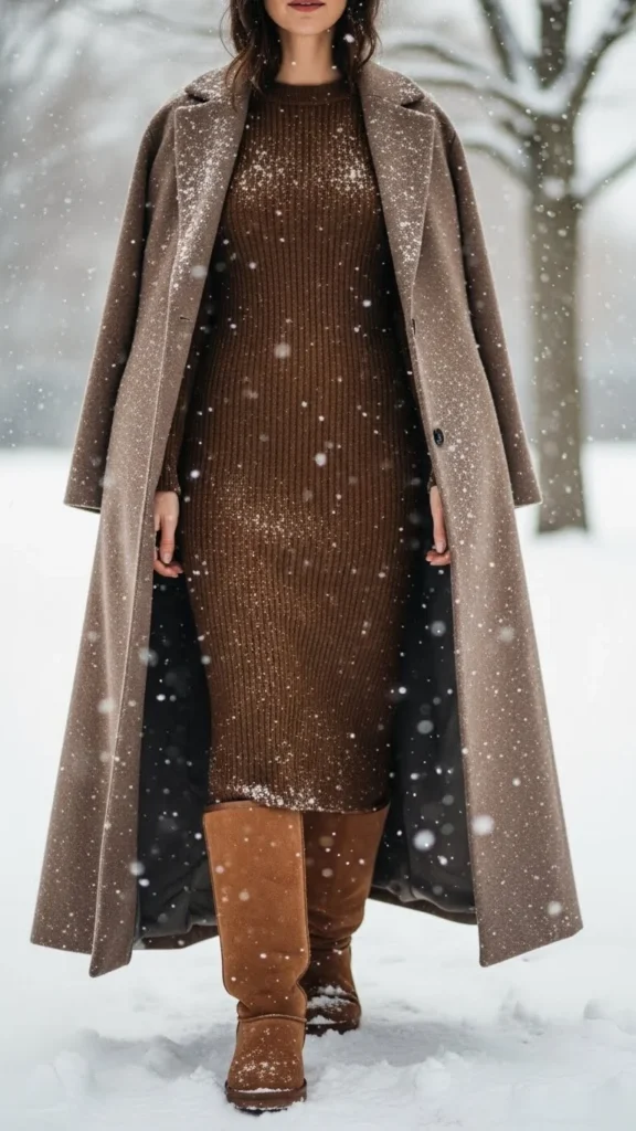 A maxi coat elongates the look. A knit dress flows softly underneath. The boots add plush texture. This pairing suits dinner outings or calm winter walks. Knit dresses are warm and flattering. Choose a coat colour that blends with the dress’s tone.