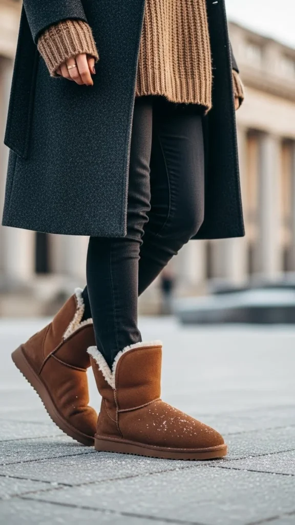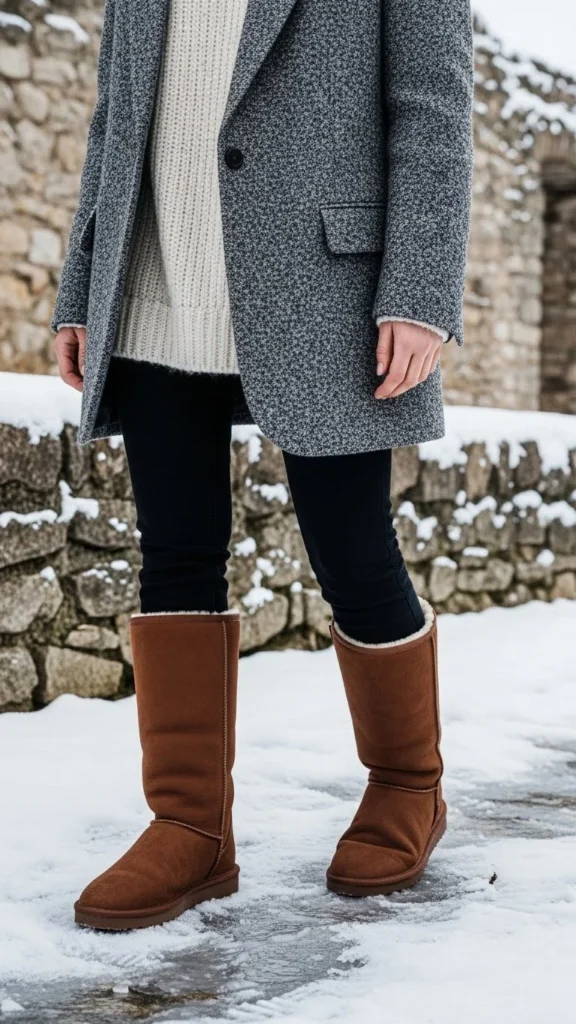 Soft neutrals enhance the boots’ texture. Layer a knit top, cardigan, and coat. Wear jeans or leggings. This combination suits quiet winter days. Neutral layers mix easily and highlight the boots’ plush details. Keep accessories simple.