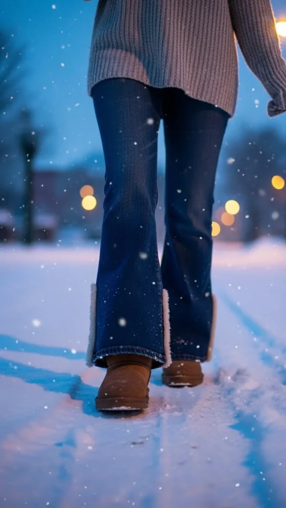 Flares create soft motion. Ribbed knits add texture. The boots peek out, giving subtle texture at the hem. This outfit suits everyday winter plans. Flared jeans pair well with fitted sweaters. Choose boots with a thicker sole for comfort.