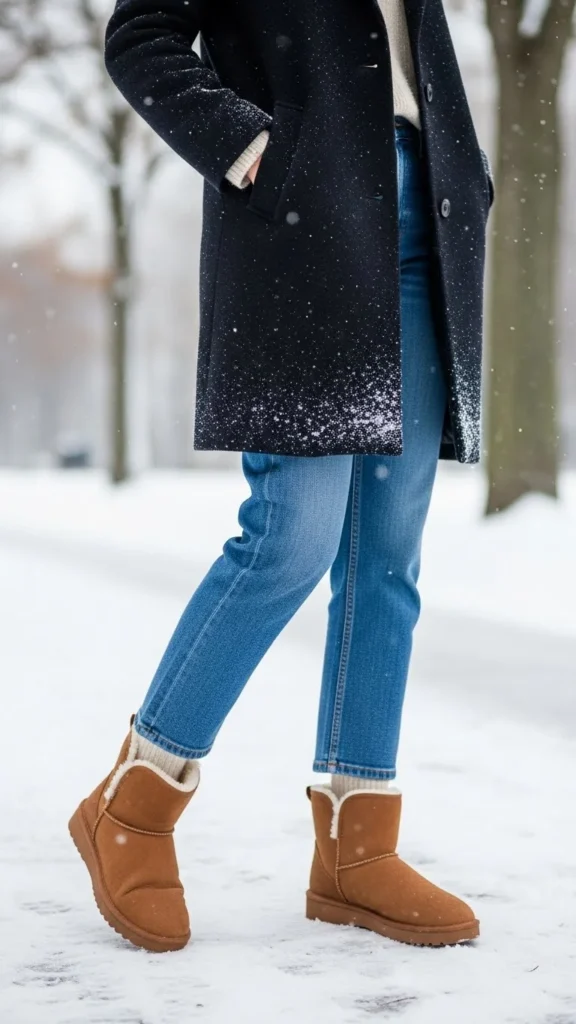 Straight jeans sit well above ankle boots. A wool coat sharpens the silhouette. Choose neutral tones so the boots remain the focal texture. This outfit works for coffee runs or winter commutes. Straight jeans are easy to thrift, and wool coats appear often in secondhand shops. Roll the jean hem slightly if it meets the boot top awkwardly. Add a scarf in a soft fabric to complement the shearling trim.