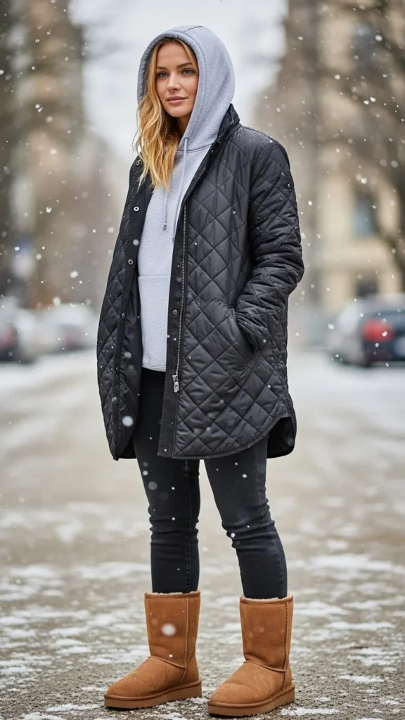 Layering a quilted jacket over a hoodie adds warmth without bulk. The boots bring softness and texture. Wear jeans or leggings. This outfit suits everyday winter wear. Quilted jackets are lightweight yet warm. Pick colours that harmonize with the boot shade.