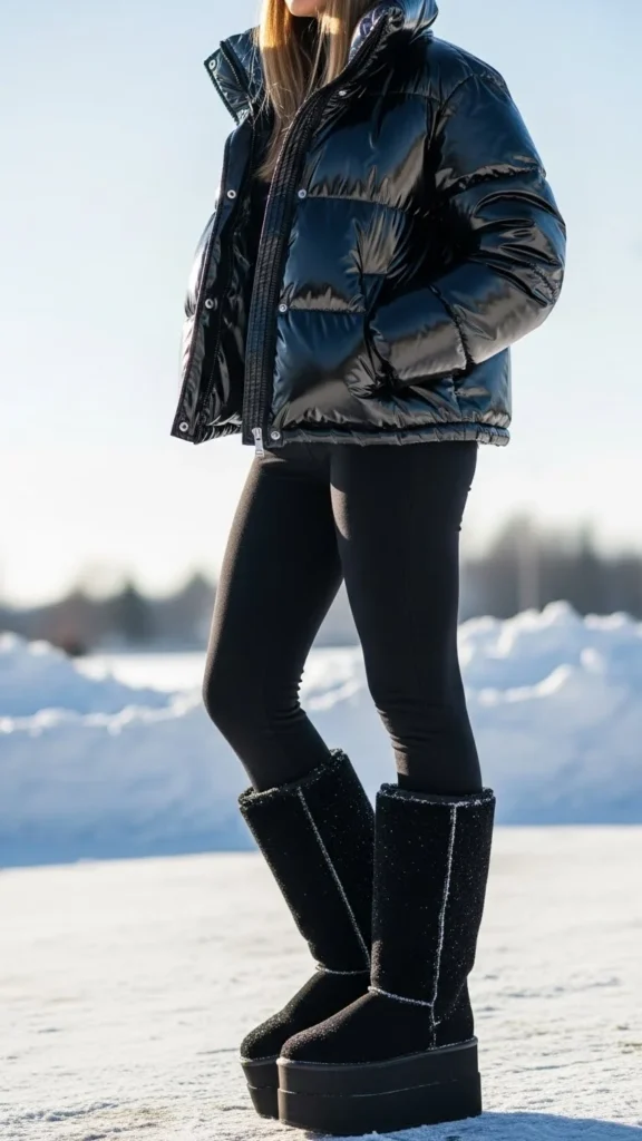 Platform soles add subtle height. Leggings keep the lower half clean. A puffer jacket adds warmth without hiding the boots. This look suits school days, errands, or travel. Thermal leggings offer extra insulation. Many puffer jackets come in budget-friendly versions with warm filling. Keep colours simple to highlight the boots’ thick texture.