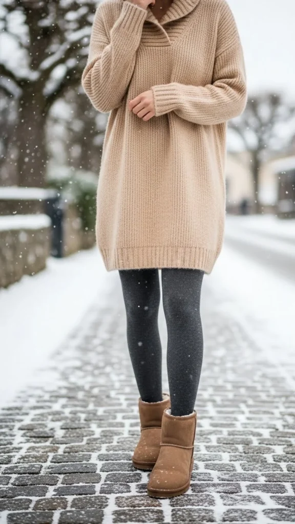 4. Shearling Boots + Sweater Dress + Tights