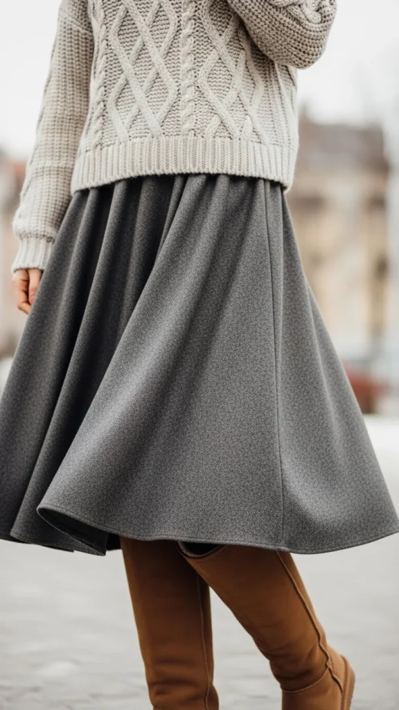 Tall boots create warmth and balance the skirt’s movement. A chunky knit keeps the outfit grounded. This pairing works for casual outings or cozy nights. Pair a wool skirt with boots for added insulation. If the knit feels oversized, tuck in a corner. Choose boots with sturdy soles for icy sidewalks.