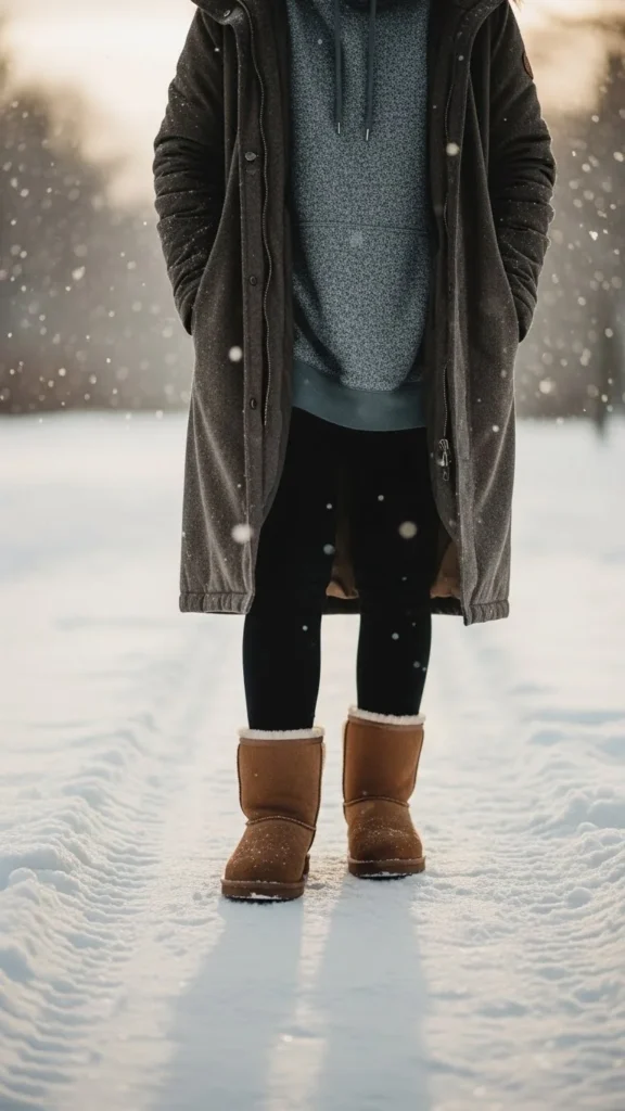 A flannel shirt adds rustic warmth, working well with cozy boot textures. Thermal leggings keep the outfit fitted. This look suits outdoor errands or casual hangouts. Many flannels come at low prices in thrift stores. Layer a tee or turtleneck under the flannel for extra heat. Pick leggings with a soft interior to complement the boots’ lining.