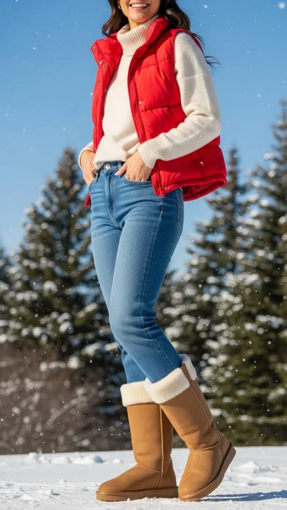 A puffer vest adds warmth without restricting movement. A turtleneck sharpens the neckline. Straight jeans keep the look simple. This pairing works for travel days or outdoor strolls. Vests are budget-friendly and layer well. Choose a vest colour that complements the boots.