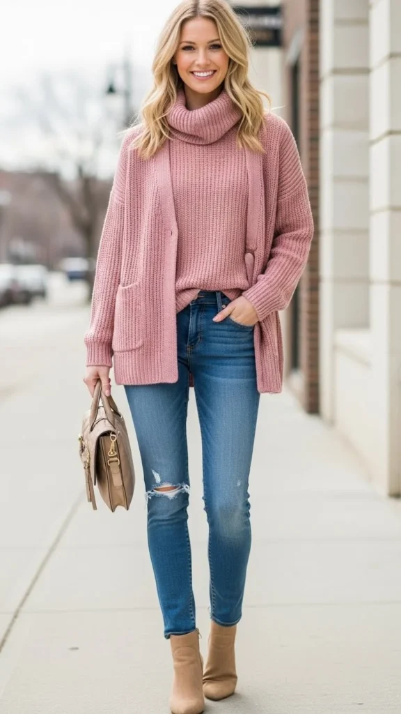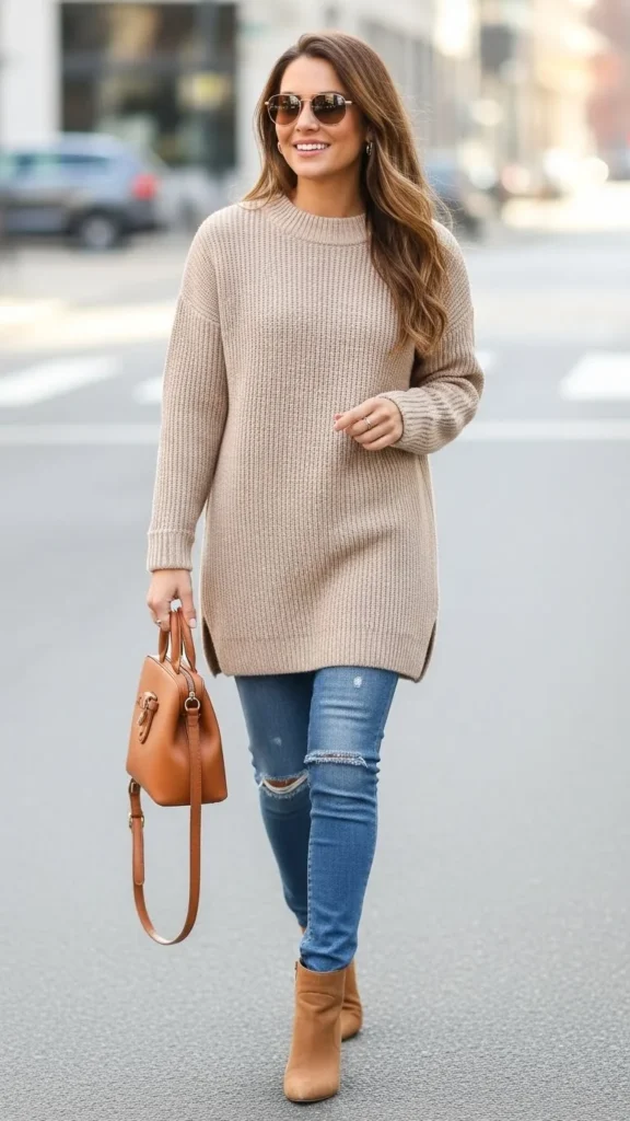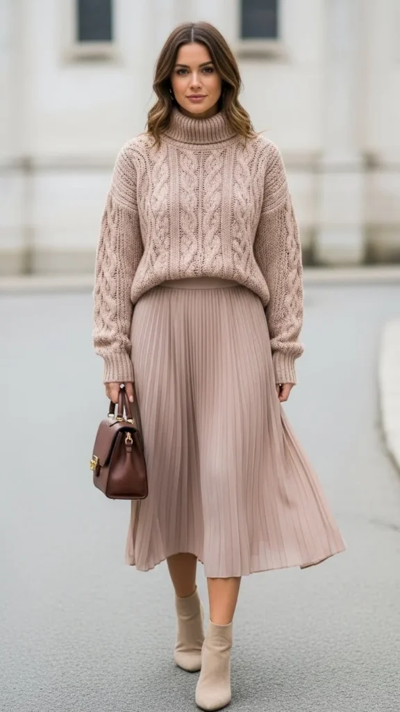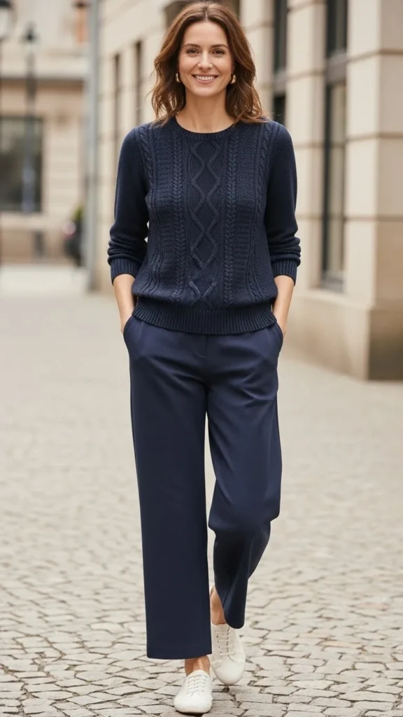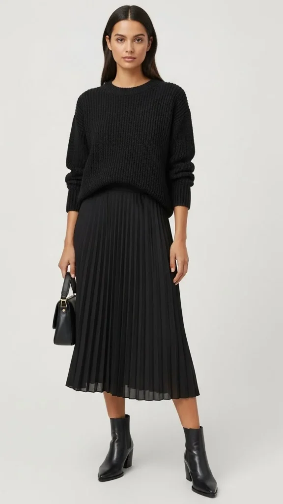 A crewneck sweater with a midi skirt mixes comfort and polish. Keep colors simple.