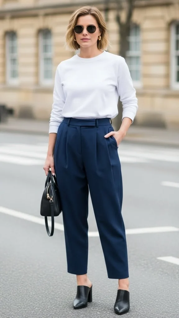 A plain tee with pleated trousers feels relaxed yet polished. Tuck the tee slightly for shape.