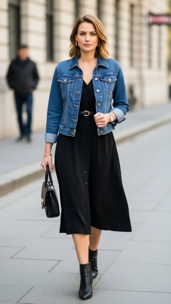 A black dress becomes more casual with a denim jacket. The contrast works well.