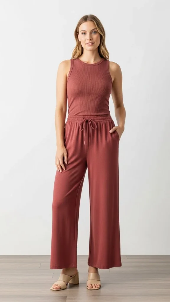 A ribbed tank paired with wide-leg pants feels relaxed yet neat. Choose breathable fabric.