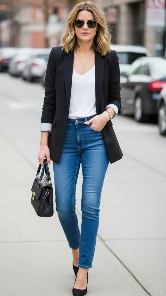 A tailored blazer paired with straight jeans creates a clean, balanced outfit. Choose a blazer with a soft structure so it drapes well. Straight jeans keep the look grounded and easy to repeat.
