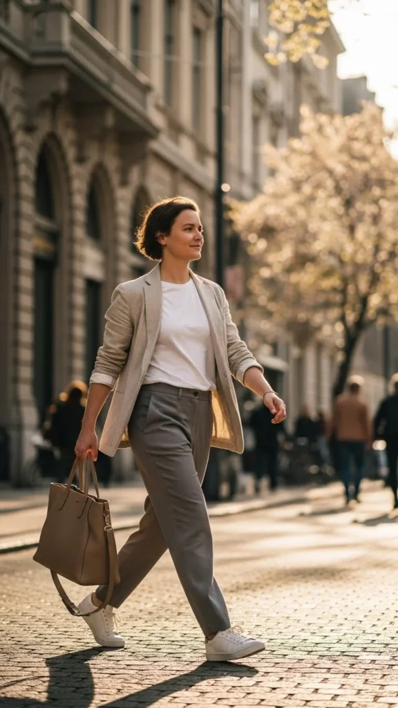 Budget tip: thrift shops often carry quality blazers. Removing shoulder pads or shortening sleeves improves fit. A plain tee underneath keeps the outfit wearable for everyday plans. Simple shoes finish the look.