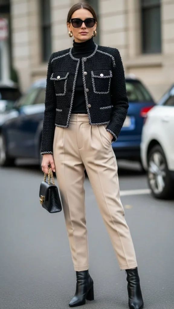 A cropped jacket balances high-waist trousers nicely. The shorter length adds shape.