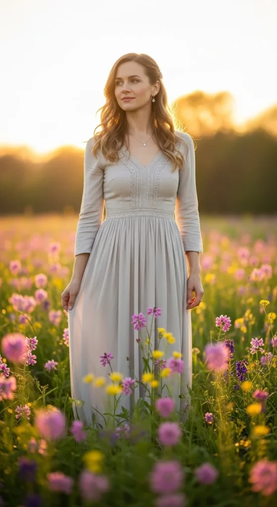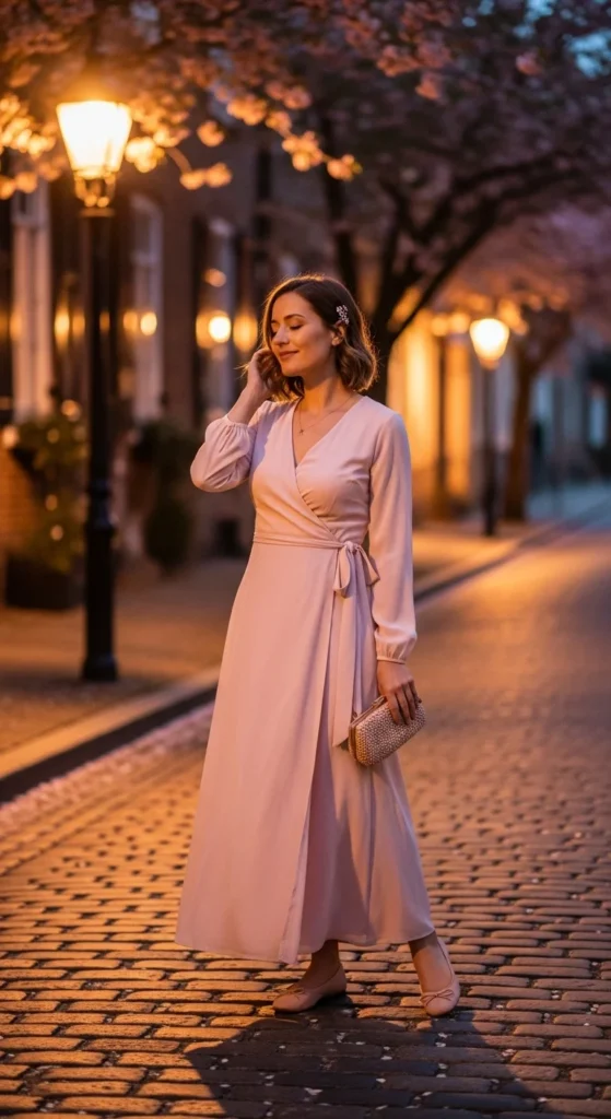 A wrap dress naturally creates a flattering shape without effort. Lightweight fabrics move well and feel comfortable through the evening. Choose muted florals, soft solids, or subtle prints for a romantic feel.
