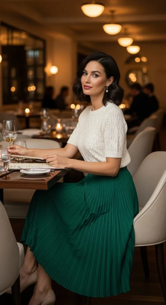 A satin skirt adds gentle shine without feeling formal. Pair it with a fitted knit top to keep the look balanced. Neutral tones feel calm and romantic.