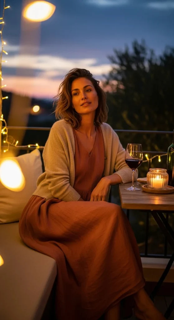 A midi dress offers coverage while still feeling elegant. A light cardigan helps with cooler evenings.