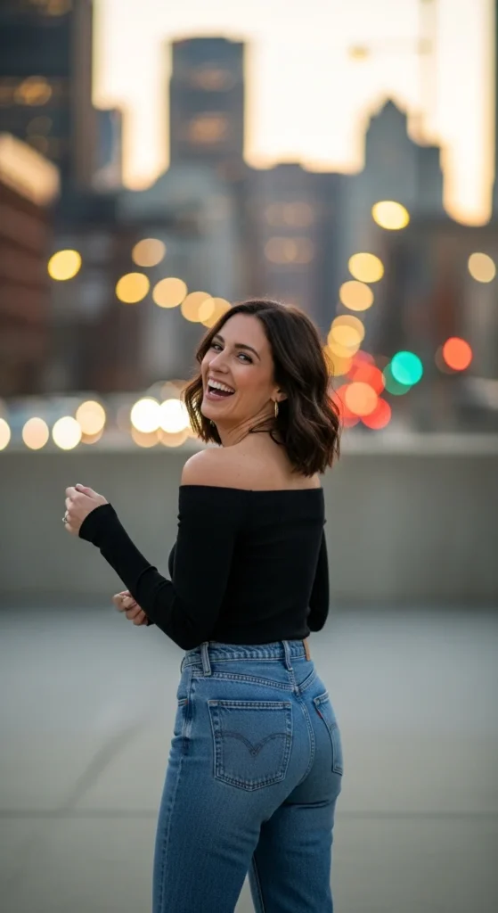 An off-shoulder top adds softness while still feeling wearable. Straight jeans ground the look and keep it relaxed.