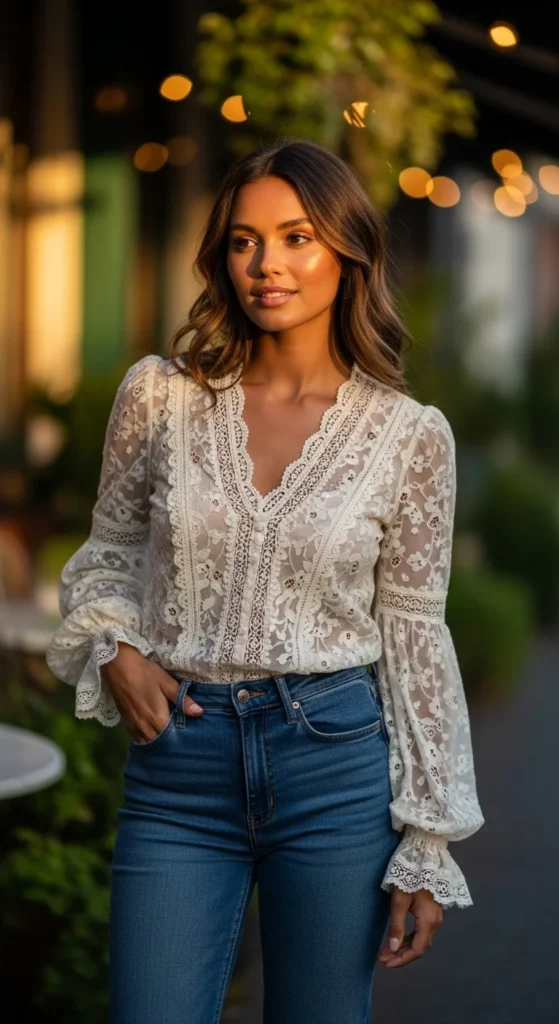 A lace blouse adds texture without heaviness. Relaxed trousers keep the outfit balanced.