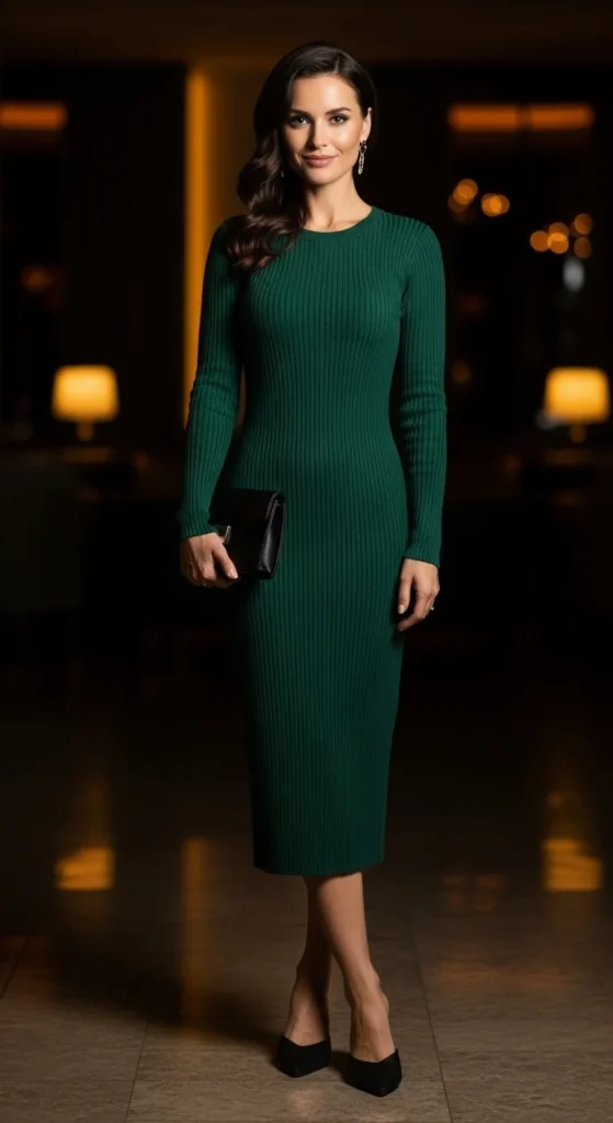Ribbed fabrics follow the body gently. Midi length feels composed.