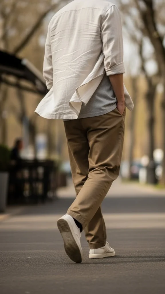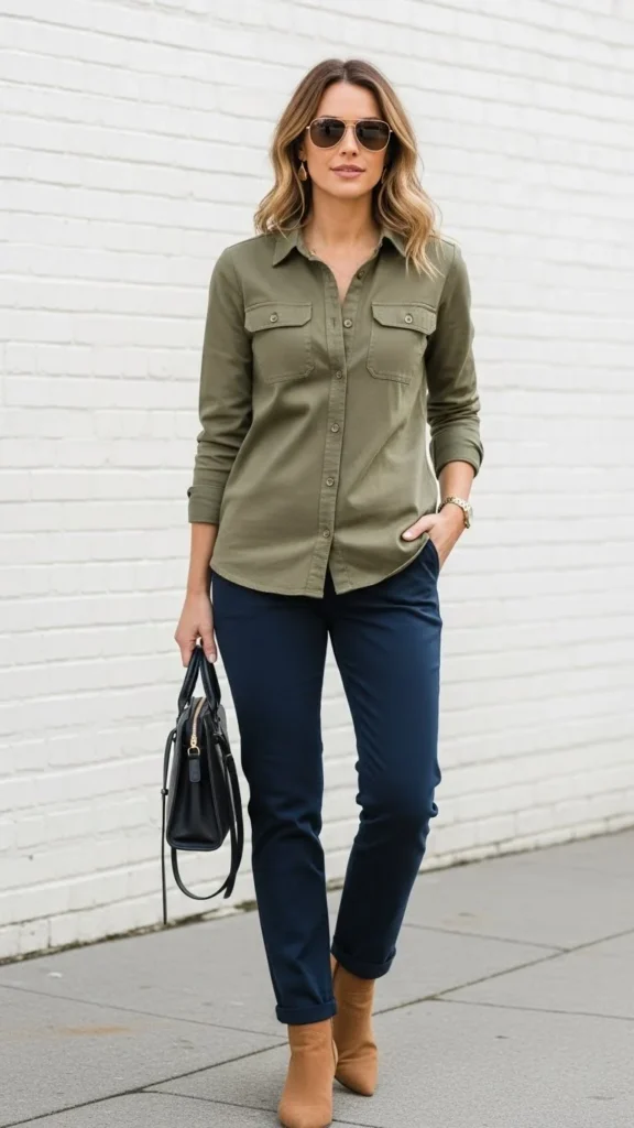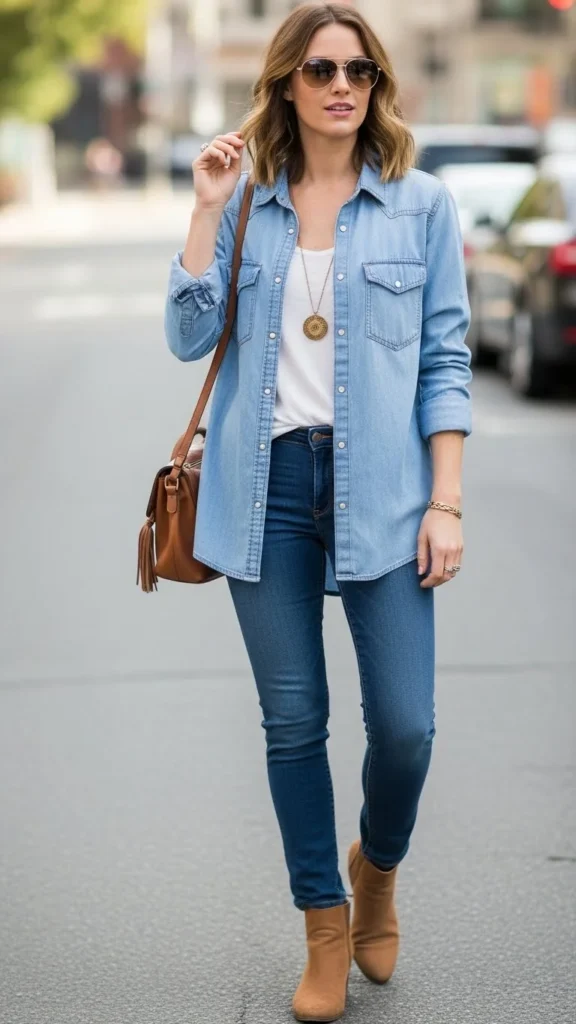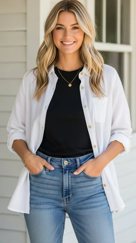 A relaxed button-down paired with straight jeans works on repeat because it feels balanced and comfortable. Cotton or linen blends are easy to wear through changing temperatures. Leave the shirt untucked or do a loose front tuck for shape. Rolling the sleeves once keeps the outfit casual.