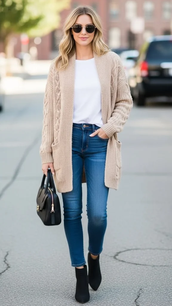 A longline cardigan adds coverage without heaviness. Wear it over a tee and jeans.