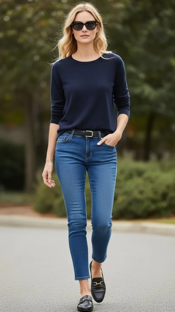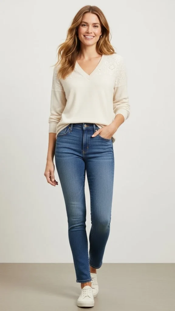 A cotton blouse with dark jeans feels relaxed and tidy. Loose fits allow movement.